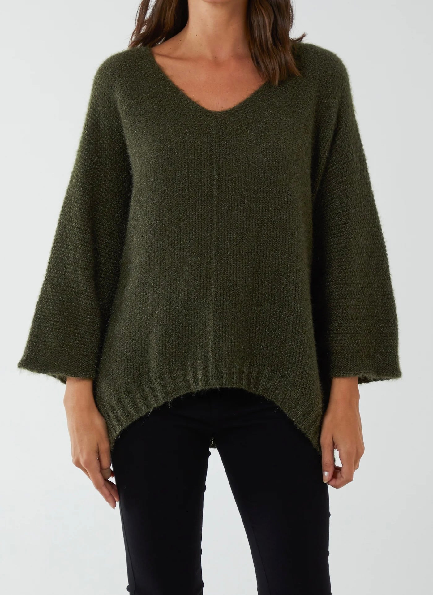 Khaki FLUFFY V-NECK EXPOSED SEAMS JUMPER