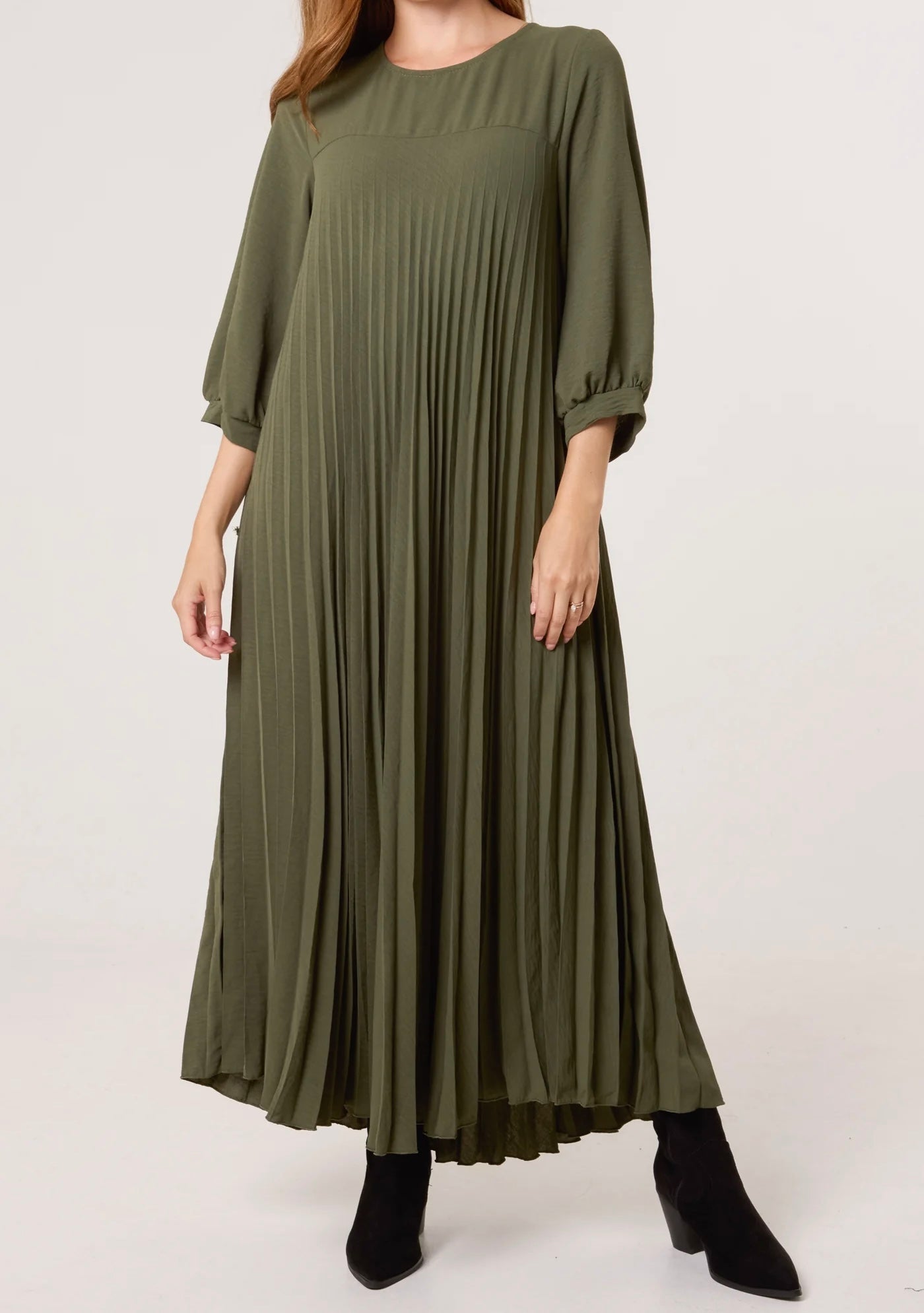 Khaki LONG SLEEVE POCKETS PLEATED MAXI DRESS